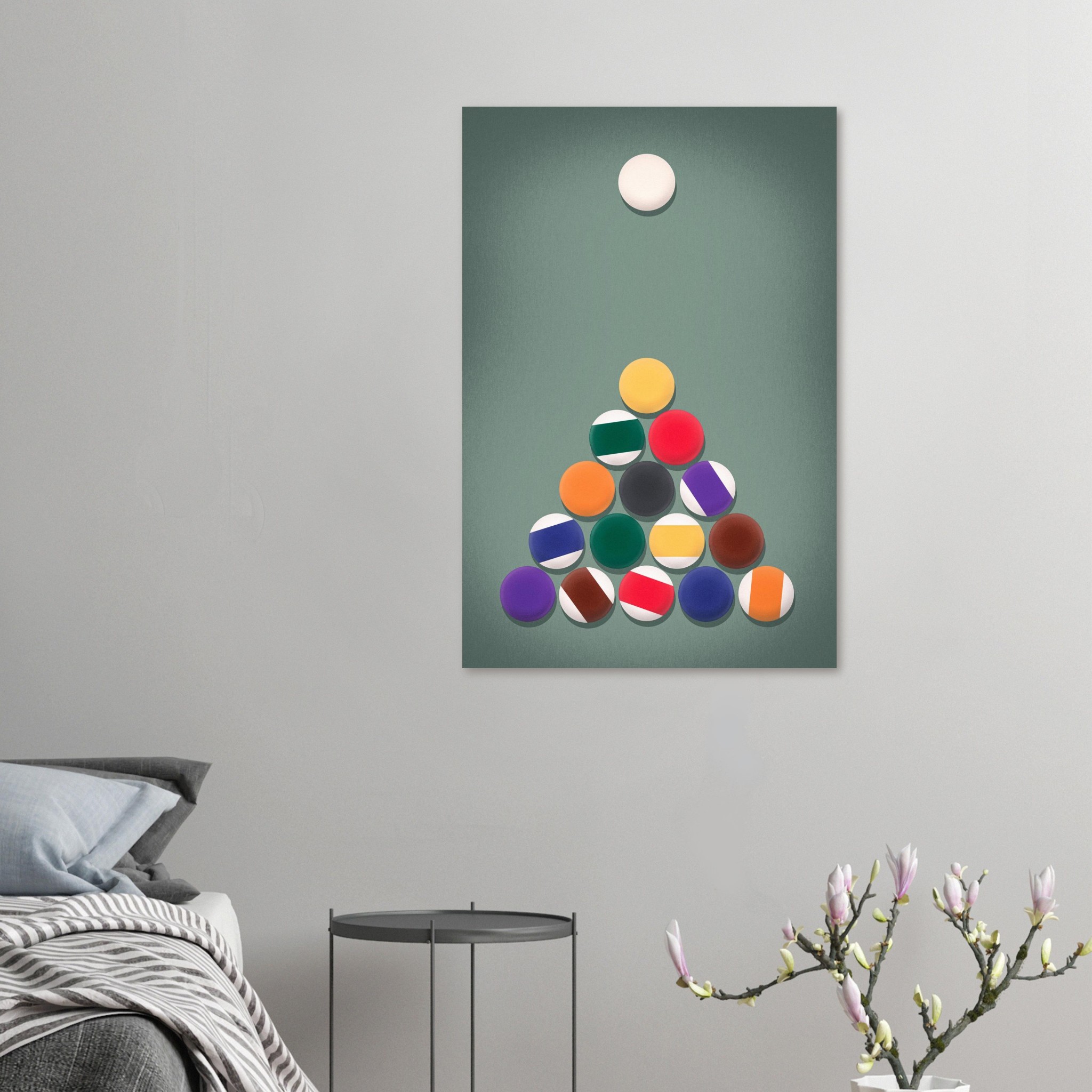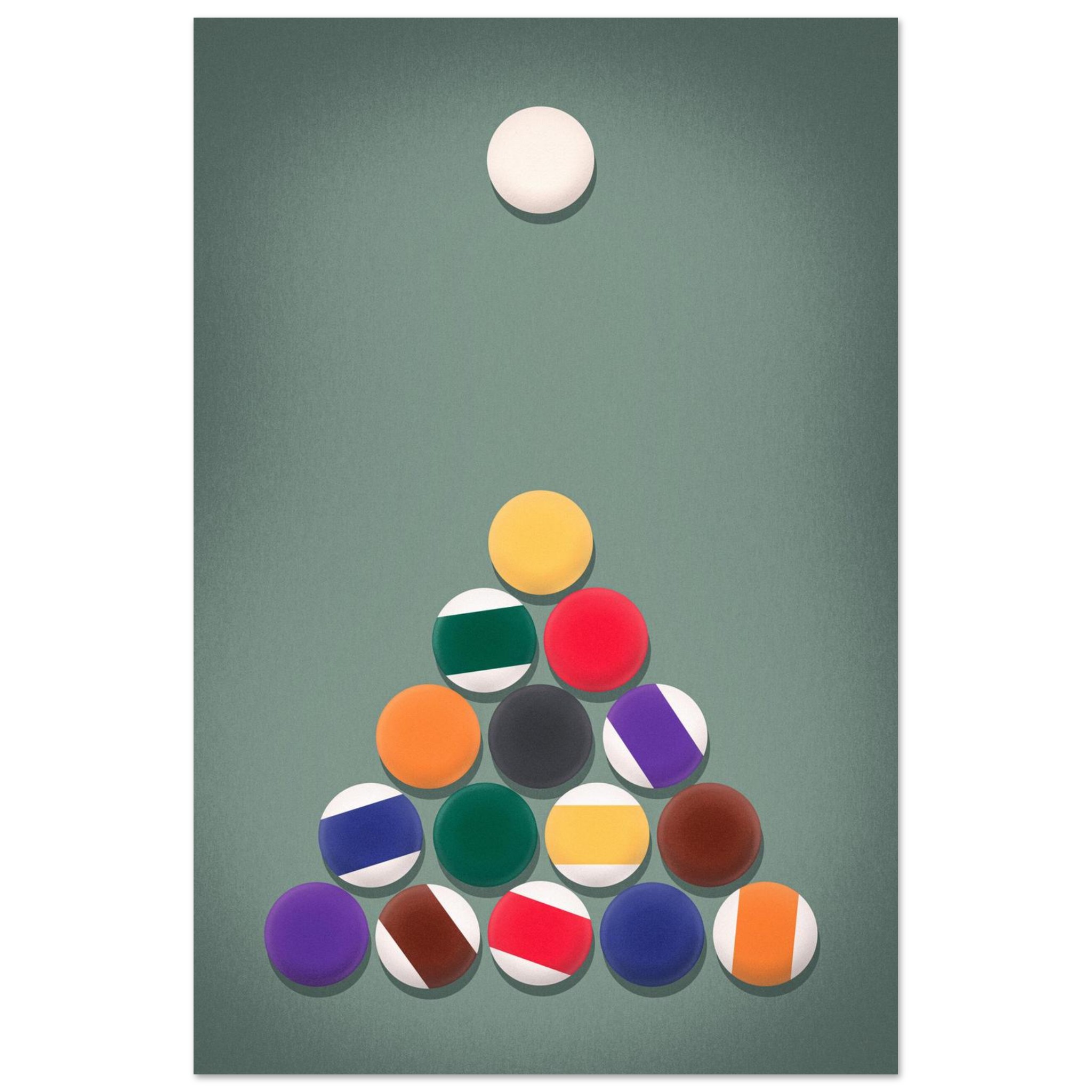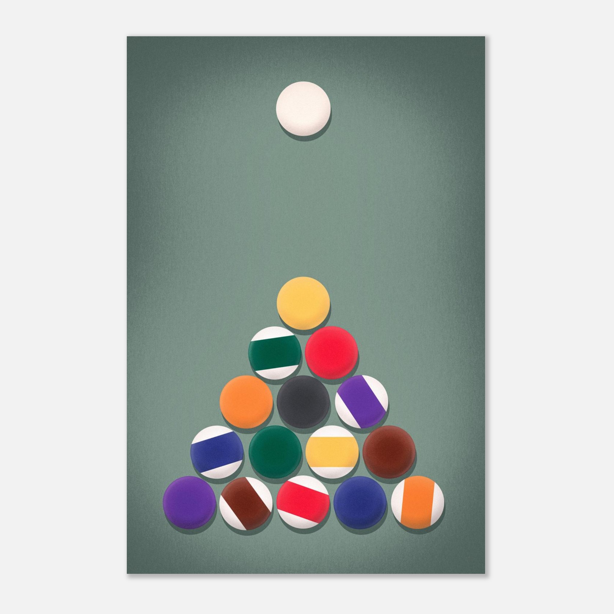 The Rack ‘Em Up Poster captures the tense stillness just before the break in a game of pool. A perfectly formed triangle of billiard balls sits centered on a soft green felt background, topped by the poised white cue ball—ready to strike. This design blends geometric harmony with a subdued retro palette, creating a minimalist yet visually rich moment of anticipation. The soft shading and flattened graphic style give it a modern vintage feel, perfect for game rooms, lounges, or anyone who appreciates the elegance and strategy of cue sports.
