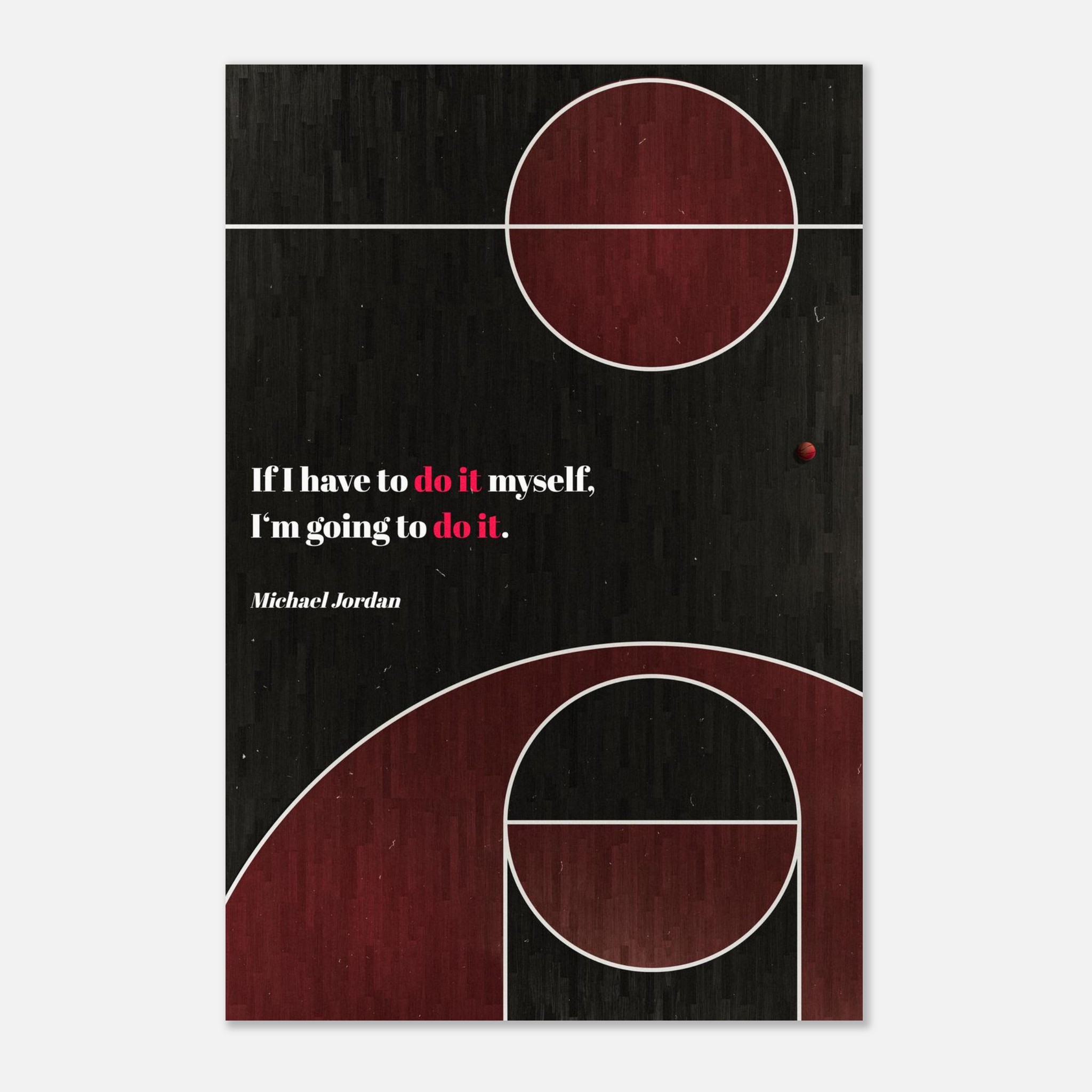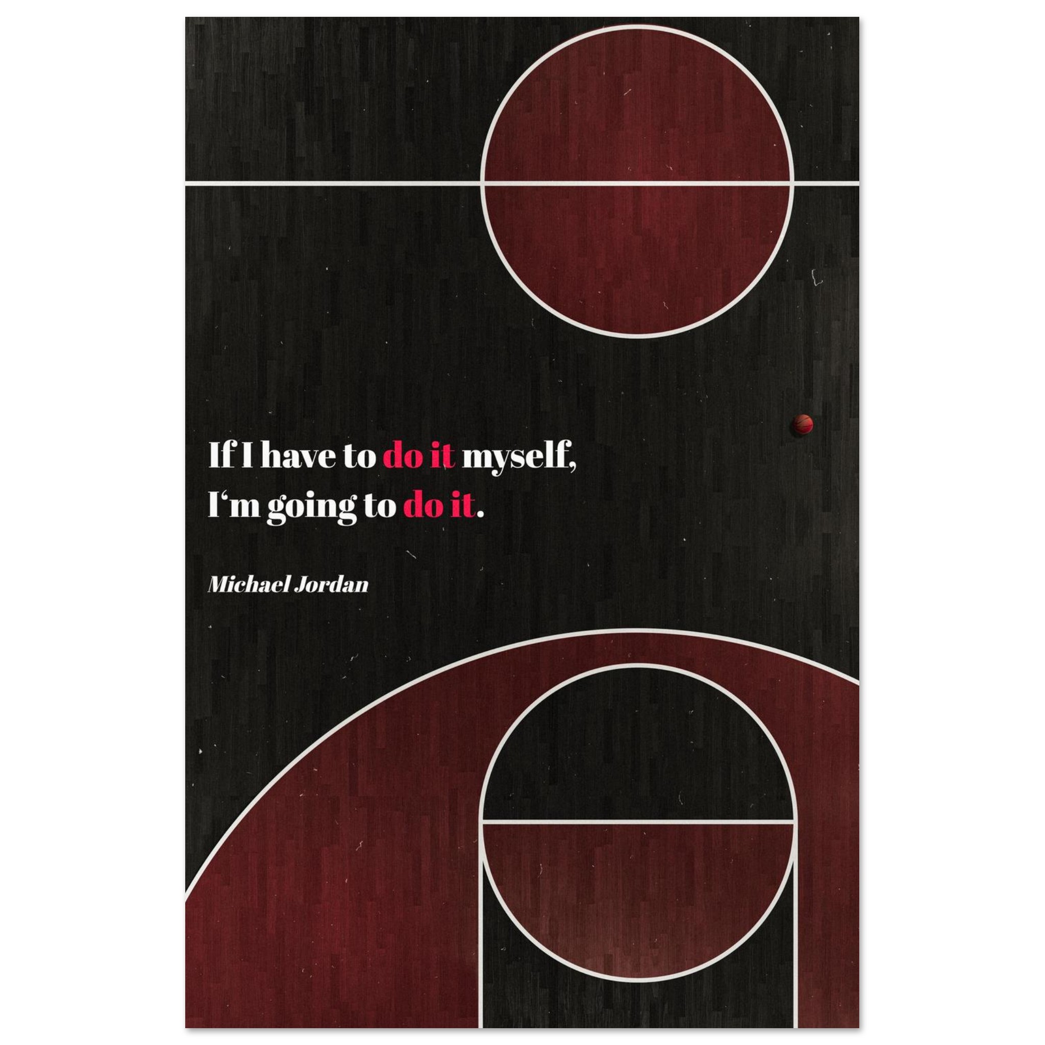 The poster shows a basketball court in shades of black and red, the colors of the Chicago Bulls. At the bottom is an inspiring quote from famous basketball player Michael Jordan: “If I have to do it myself, I’m going to do it.” The minimalist design and powerful message make this poster ideal for sports enthusiasts and anyone who likes to be motivated and inspired.