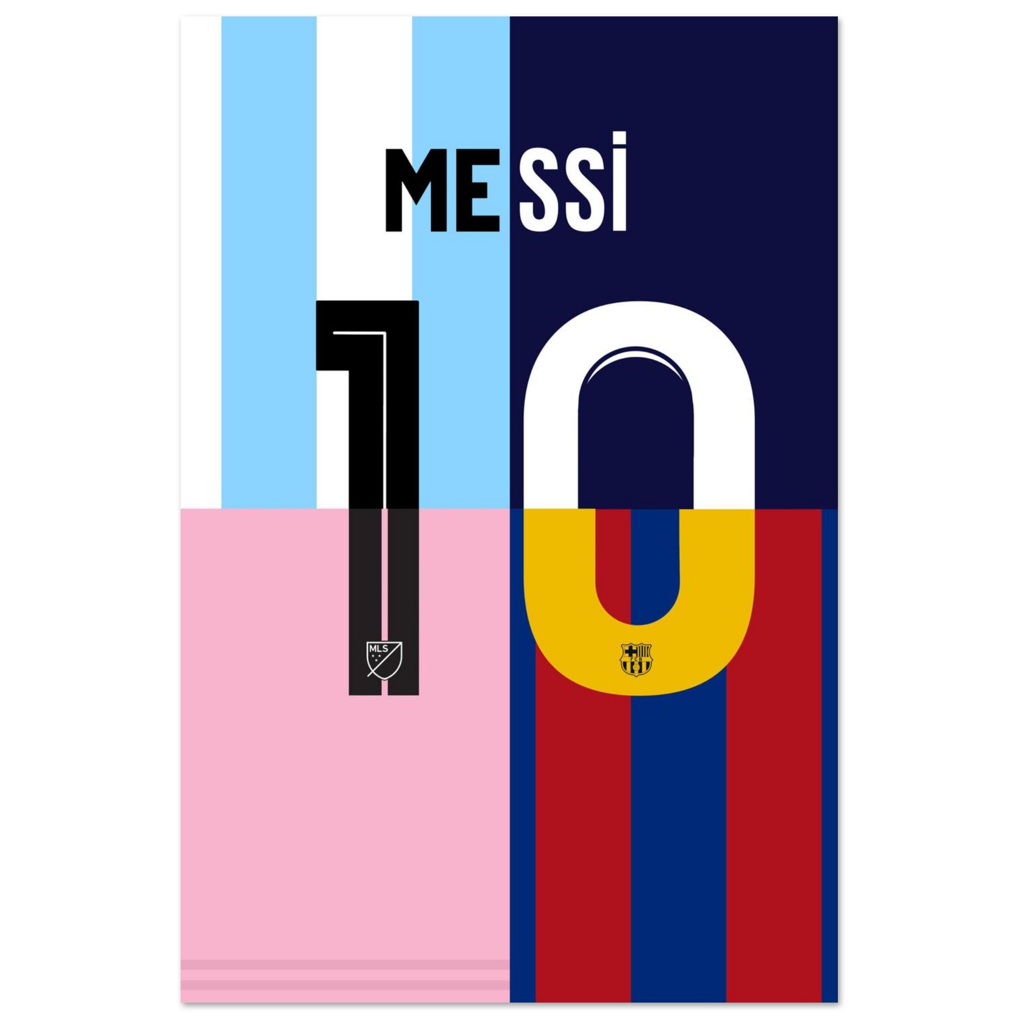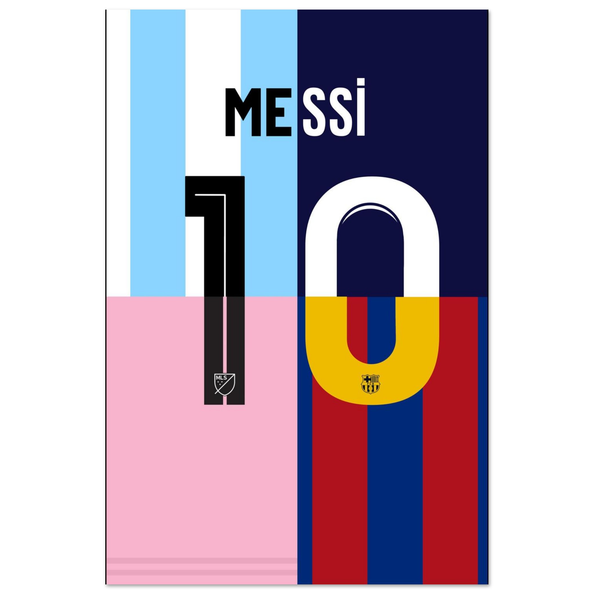 Celebrate the unparalleled legacy of Lionel Messi with this bold and vibrant “Messi 10” poster. Featuring the iconic number 10 split into the distinct colors of his legendary career—from Argentina’s sky blue and white, to Barcelona’s deep red and blue, and the modern pink of Inter Miami—this design symbolizes his journey through greatness.