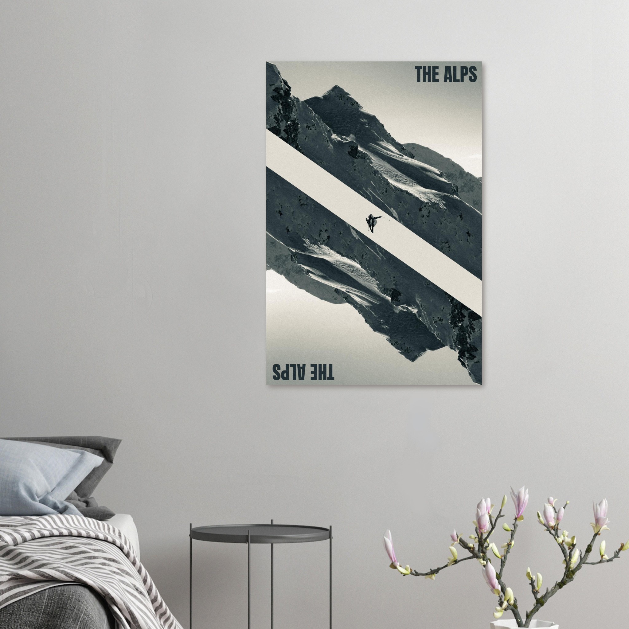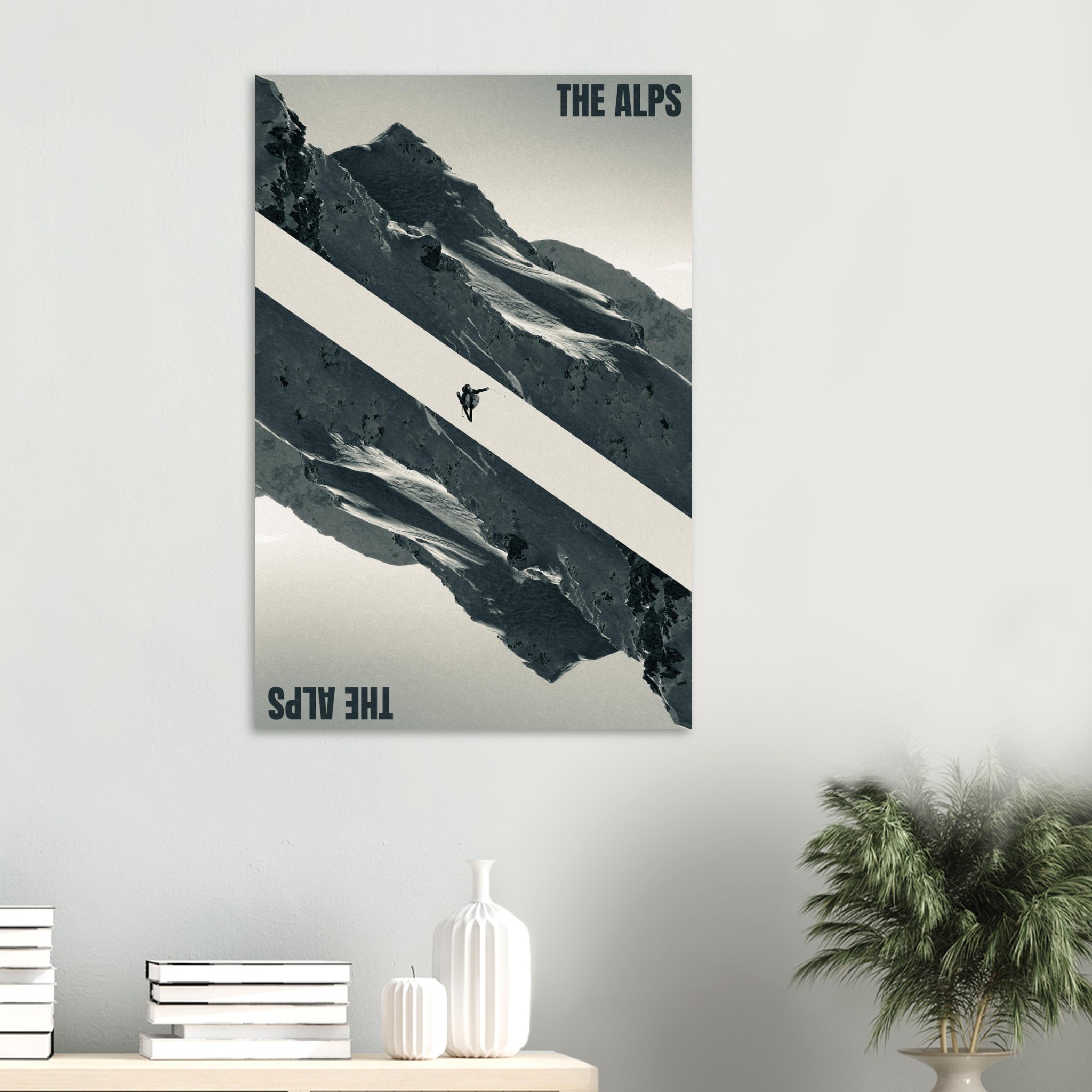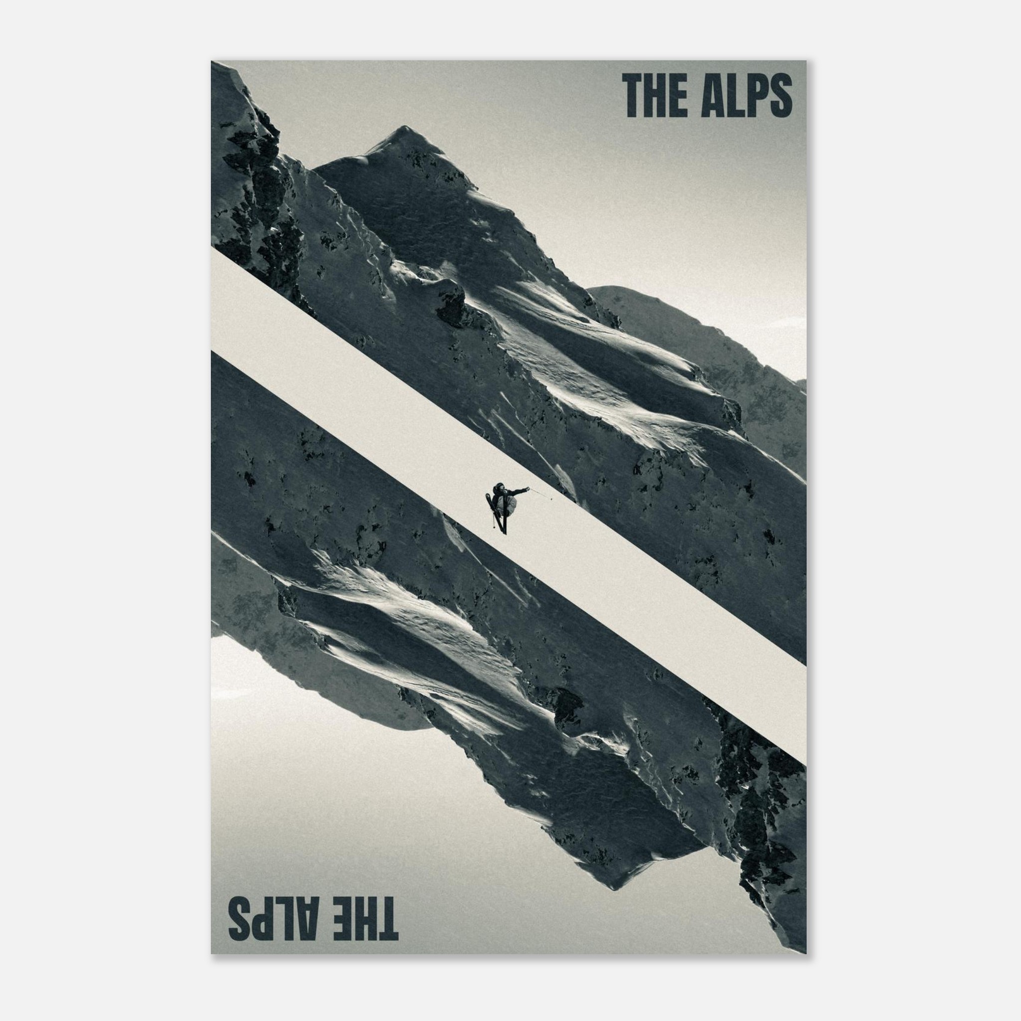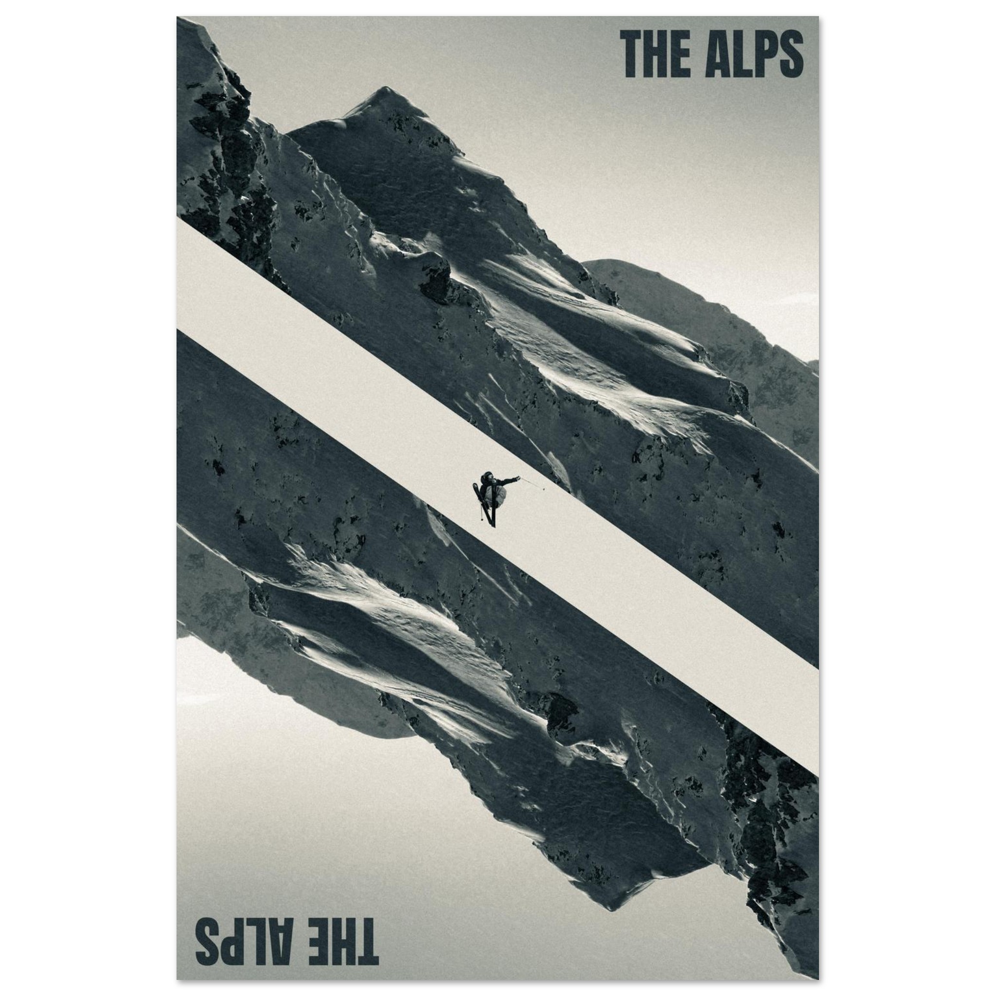 Immerse yourself in the majestic beauty of the Alps with this striking “The Alps” poster. Featuring a daring skier mid-jump against a dramatic mountainous backdrop, this design captures the thrill and grandeur of alpine adventures. The bold diagonal composition and monochromatic tones evoke a sense of movement and adventure, perfect for ski enthusiasts and mountain lovers alike.